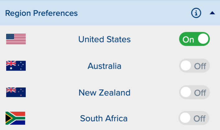 - Toggle the switch next to the region you would like to select (United States, Australia, New Zealand, or South Africa).