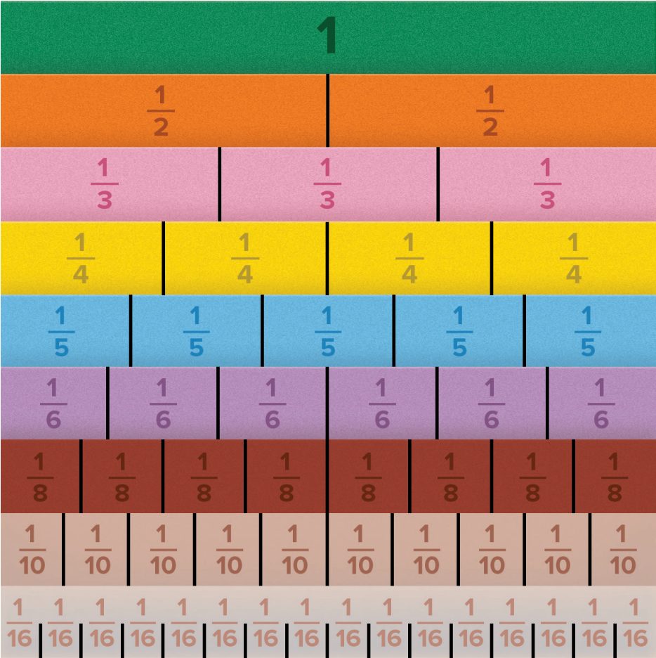 The Fraction Overlays are physical, integrated manipulatives consisting of two key parts: colored vinyl pieces and clear, lined vinyl overlays that teach math operations with fractions. The colored vinyl pieces represent the numerator and correspond to the colors used in the Math-U-See Integer Blocks. The clear, lined vinyl overlays portray the denominator and show fractional parts that layer over the colored vinyl pieces, allowing students to see the relationship between wholes and parts.