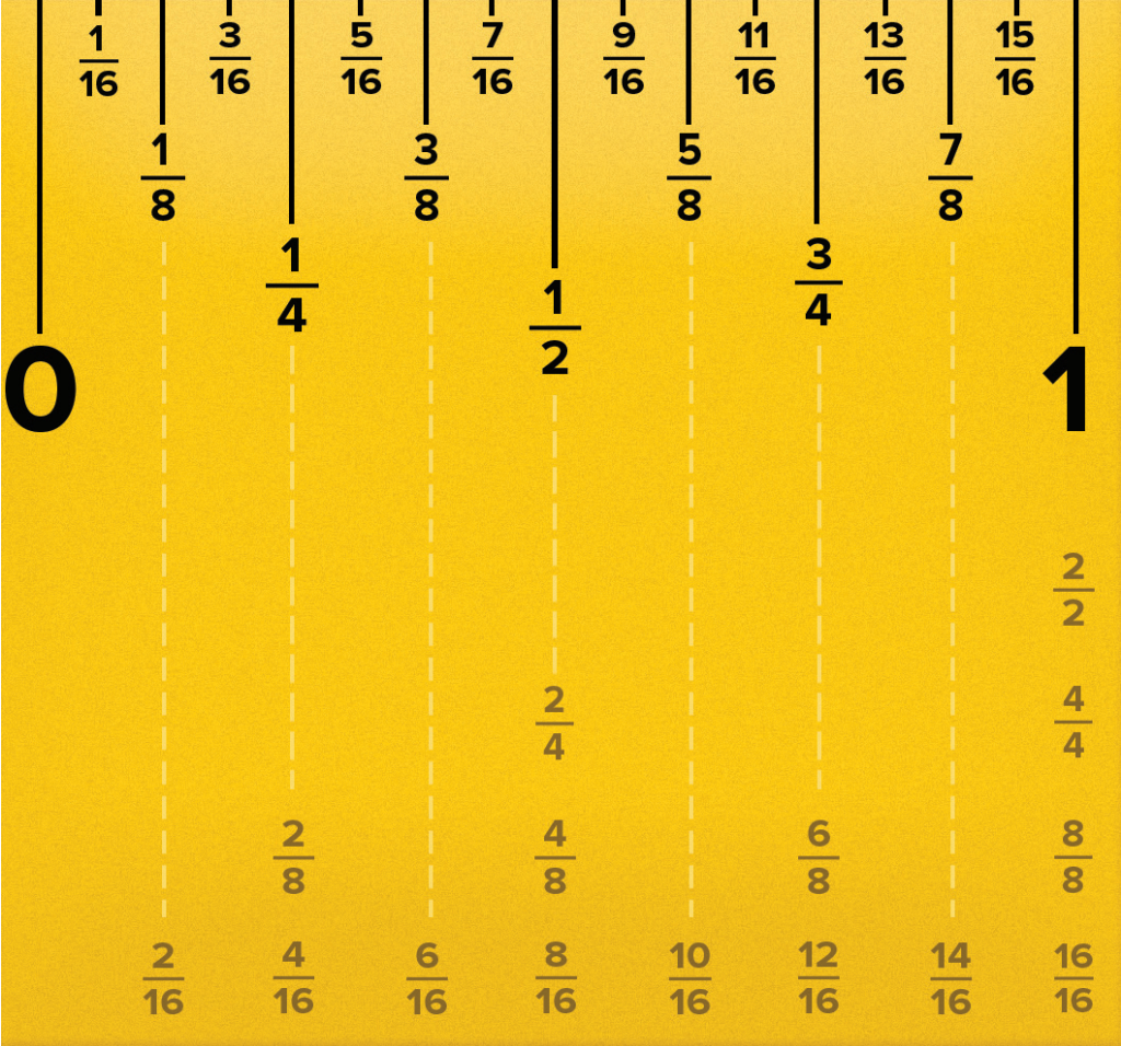 This reference connects fraction overlays for halves, fourths, eighths, and sixteenths to the markings on a ruler. It helps students see how fractional measurements relate to real-world applications, such as inches and other customary units.
